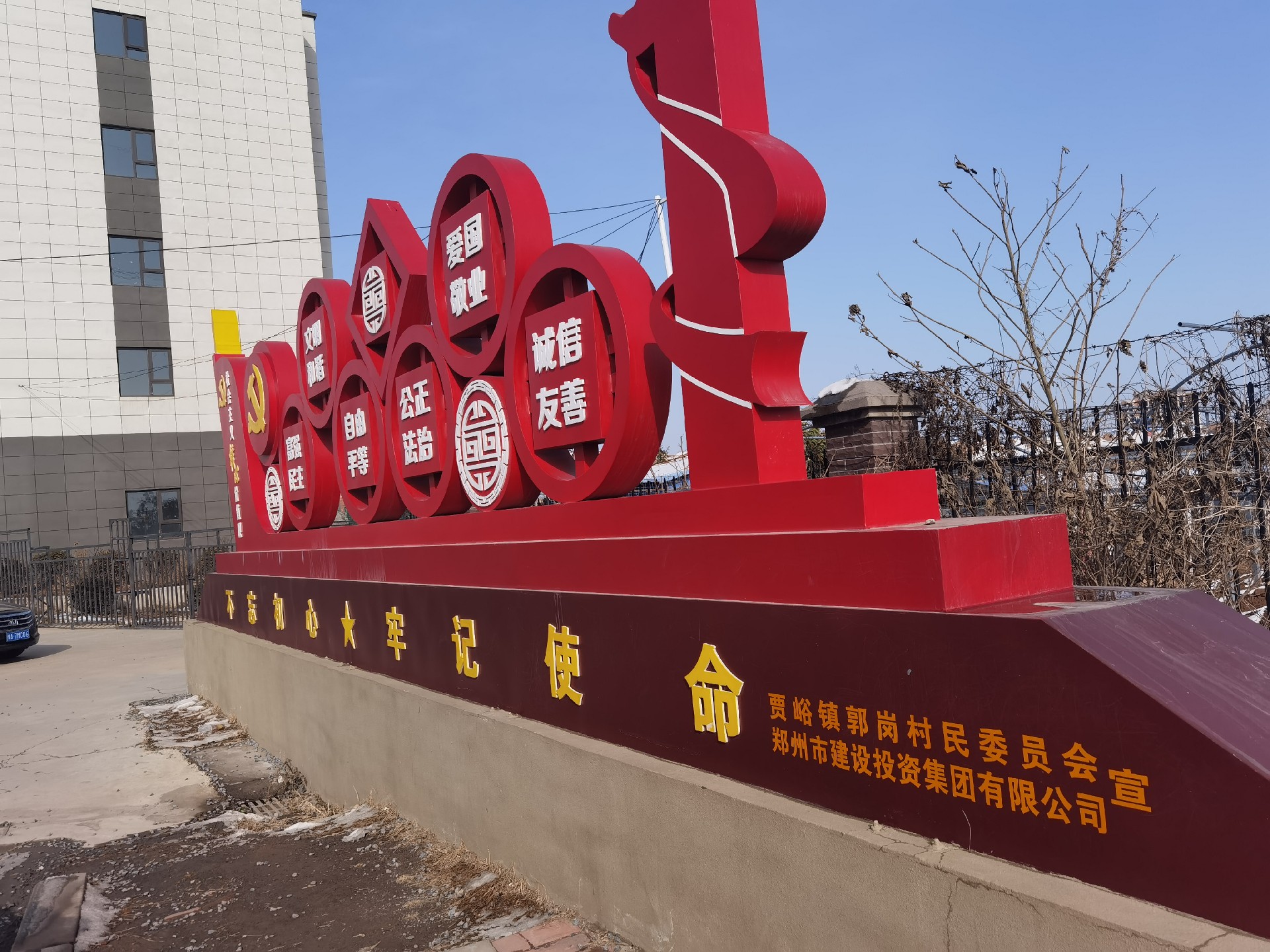 营造氛围,助推文明创建“添动力”。在前期多次沟通基础上,建投集团与郭岗村共同制作了“社会主义核心价值观”主题墙1面,精神文明宣传栏10块,并完善了党建宣传长廊和村史馆建设。“社会主义核心价值观”主题墙由金属底座和亚克力面板共同组成,整体大小约80平方,位于郭岗村村委后方的广场中央。上方呈现着“24字”核心价值观内容,清晰醒目,成为扮靓村容村貌的风景线和展现文明风尚的“新名片”。精神文明宣传栏涵盖习近平新时代中国特色社会主义思想、深入贯彻落实党的二十大精神、弘扬优秀传统文化、倡树文明新风等内容。党建宣传长廊和村史馆是由建投集团在上轮结对帮扶中建设完成并已投入使用,本轮帮创进一步完善了巩固脱贫攻坚成果展示、“五星支部”创建等内容。