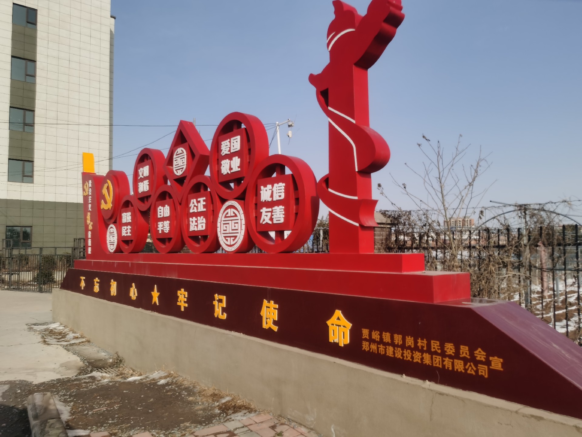 营造氛围,助推文明创建“添动力”。在前期多次沟通基础上,建投集团与郭岗村共同制作了“社会主义核心价值观”主题墙1面,精神文明宣传栏10块,并完善了党建宣传长廊和村史馆建设。“社会主义核心价值观”主题墙由金属底座和亚克力面板共同组成,整体大小约80平方,位于郭岗村村委后方的广场中央。上方呈现着“24字”核心价值观内容,清晰醒目,成为扮靓村容村貌的风景线和展现文明风尚的“新名片”。精神文明宣传栏涵盖习近平新时代中国特色社会主义思想、深入贯彻落实党的二十大精神、弘扬优秀传统文化、倡树文明新风等内容。党建宣传长廊和村史馆是由建投集团在上轮结对帮扶中建设完成并已投入使用,本轮帮创进一步完善了巩固脱贫攻坚成果展示、“五星支部”创建等内容。